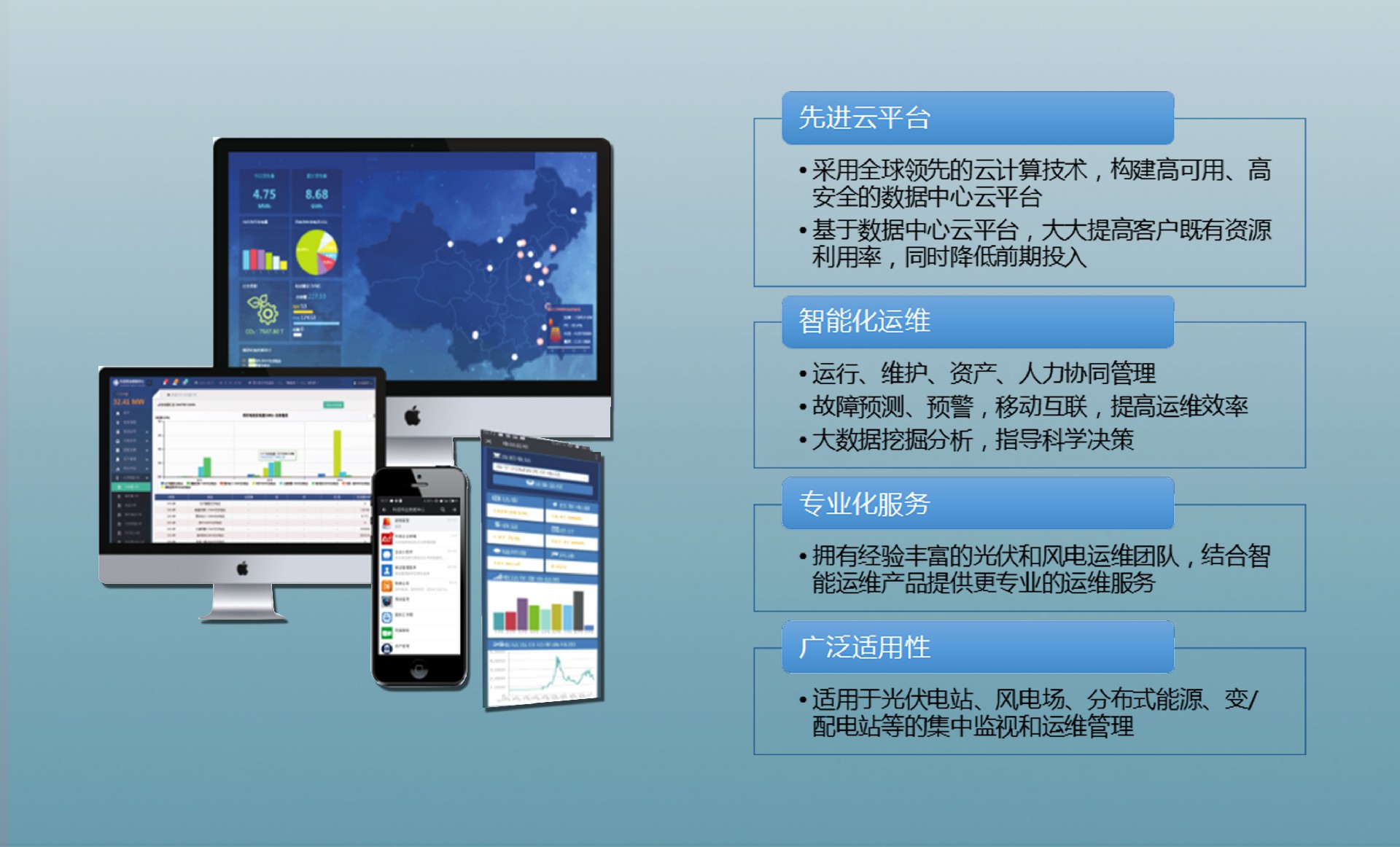 2)光伏電站健康運(yùn)行25年的重要保障,可實(shí)時(shí)監(jiān)控光伏電站的發(fā)電參數(shù)和發(fā)電效率、智能識(shí)別電站故障和診斷報(bào)警、自動(dòng)預(yù)測(cè)發(fā)電量趨勢(shì)和剩余壽命