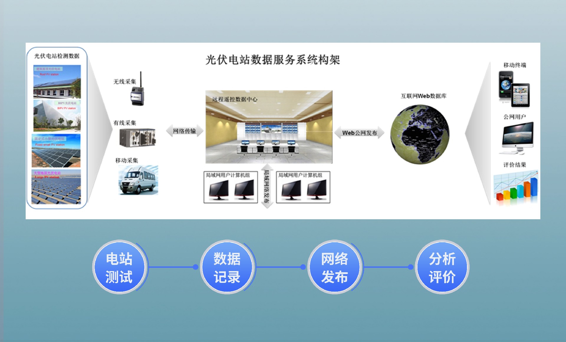 光伏電站智能檢測(cè)和評(píng)估系統(tǒng)集成了互聯(lián)網(wǎng)技術(shù)和大數(shù)據(jù)融合技術(shù),系統(tǒng)硬件基于主流的實(shí)時(shí)智能操作系統(tǒng)和硬件邏輯處理平臺(tái),內(nèi)嵌高性能的采集裝置和通訊互聯(lián)芯片,可構(gòu)建模塊化、多節(jié)點(diǎn)、分布式的大規(guī)模測(cè)試網(wǎng)絡(luò),采用多通道同步互連技術(shù),覆蓋超大容量光伏電站的自動(dòng)同步檢測(cè)和網(wǎng)絡(luò)數(shù)據(jù)傳輸。