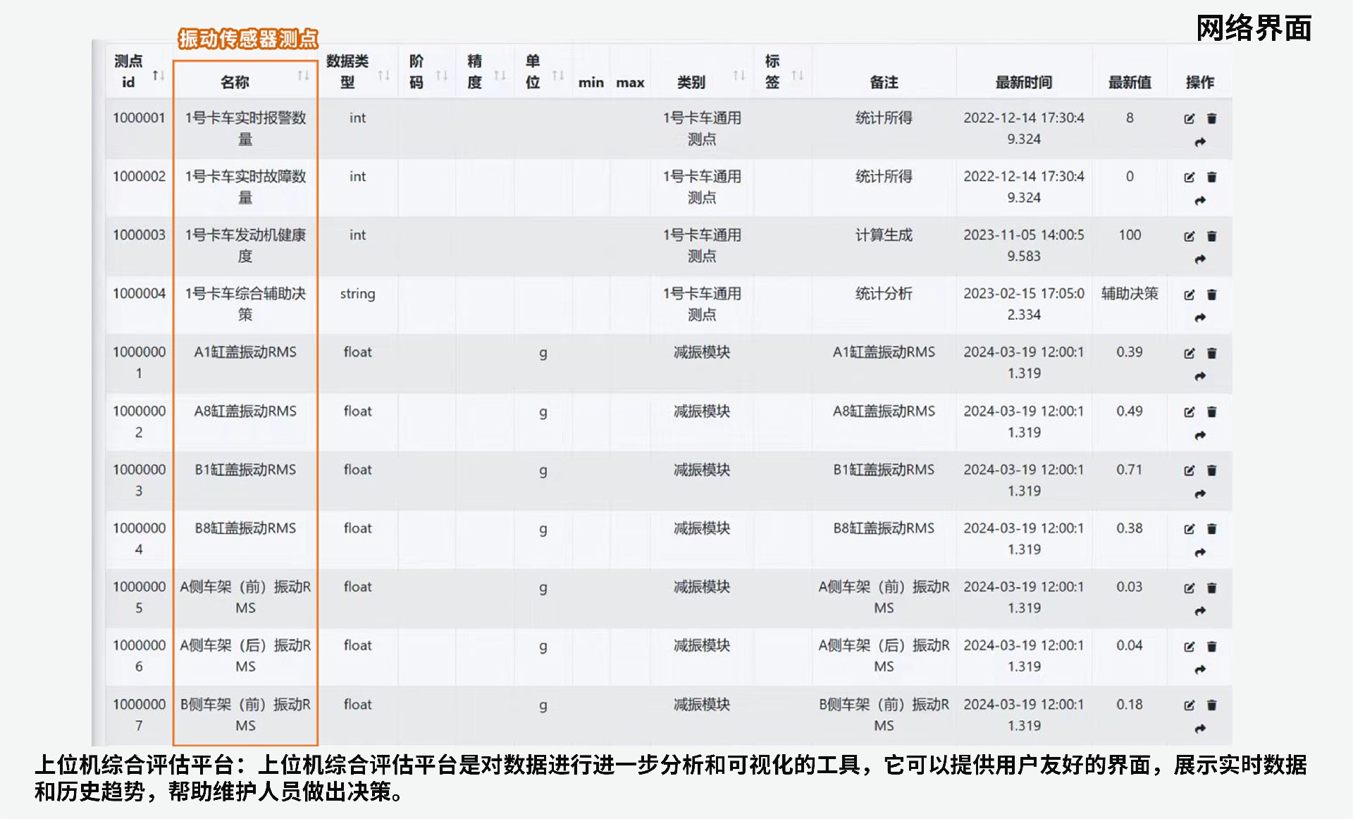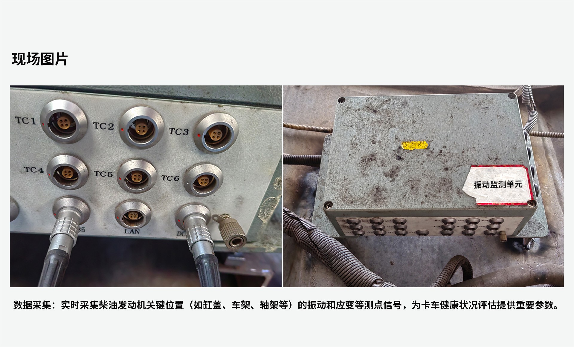 該系統(tǒng)旨在通過實(shí)時(shí)采集柴油機(jī)缸蓋、車架振動(dòng)有效值,軸架應(yīng)變,瞬時(shí)轉(zhuǎn)速波動(dòng)率,扭振振幅等數(shù)據(jù)的觀測實(shí)現(xiàn)柴油機(jī)整機(jī)振動(dòng)異常狀態(tài)、增壓器異常狀態(tài)、氣缸異常狀態(tài)的健康狀態(tài)在線診斷,為維護(hù)人員提供有價(jià)值的健康狀態(tài)監(jiān)測分析,從而實(shí)現(xiàn)降低維護(hù)成本、延長設(shè)備使用壽命的目標(biāo),提高生產(chǎn)效率。